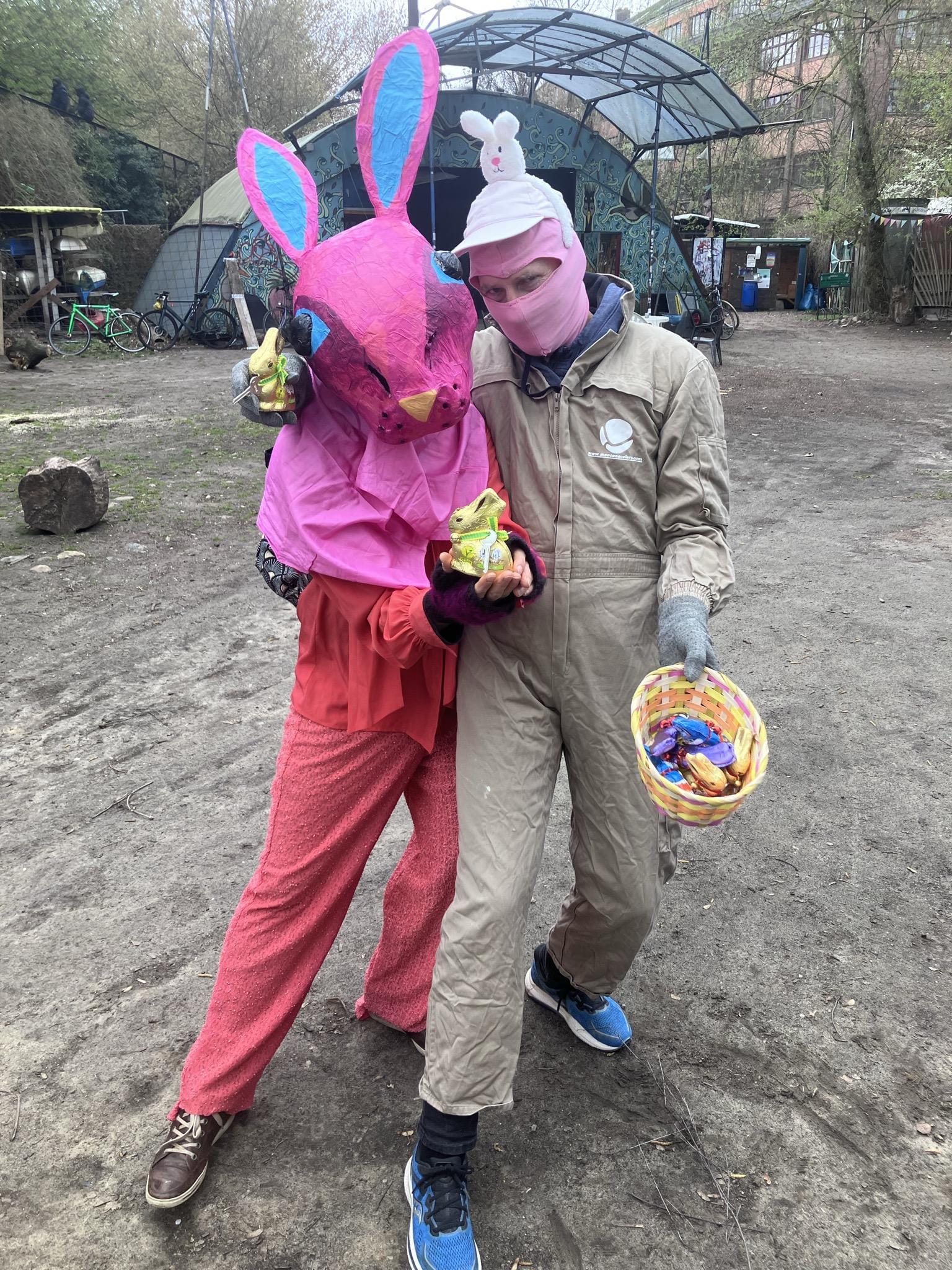 The masked "Union of Easter Bunnies" handed out chocolates with the master key to the park's controversial fence locks – and also hid a few for members of the press.
