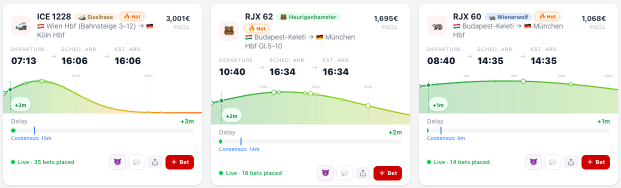 Since the site launched on March 2, it has expanded to include train data from nine more countries (including Switzerland, which, the website notes, “is the wild card – if your trains are actually on time, the game becomes even more exciting. Predicting a 0-minute delay takes real courage”). Each train route is represented by a tile, which contains basic information like scheduled arrival versus estimated arrival, and how much has already been bet on a particular train. The hottest delays can clock totals well over €20,000.